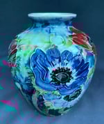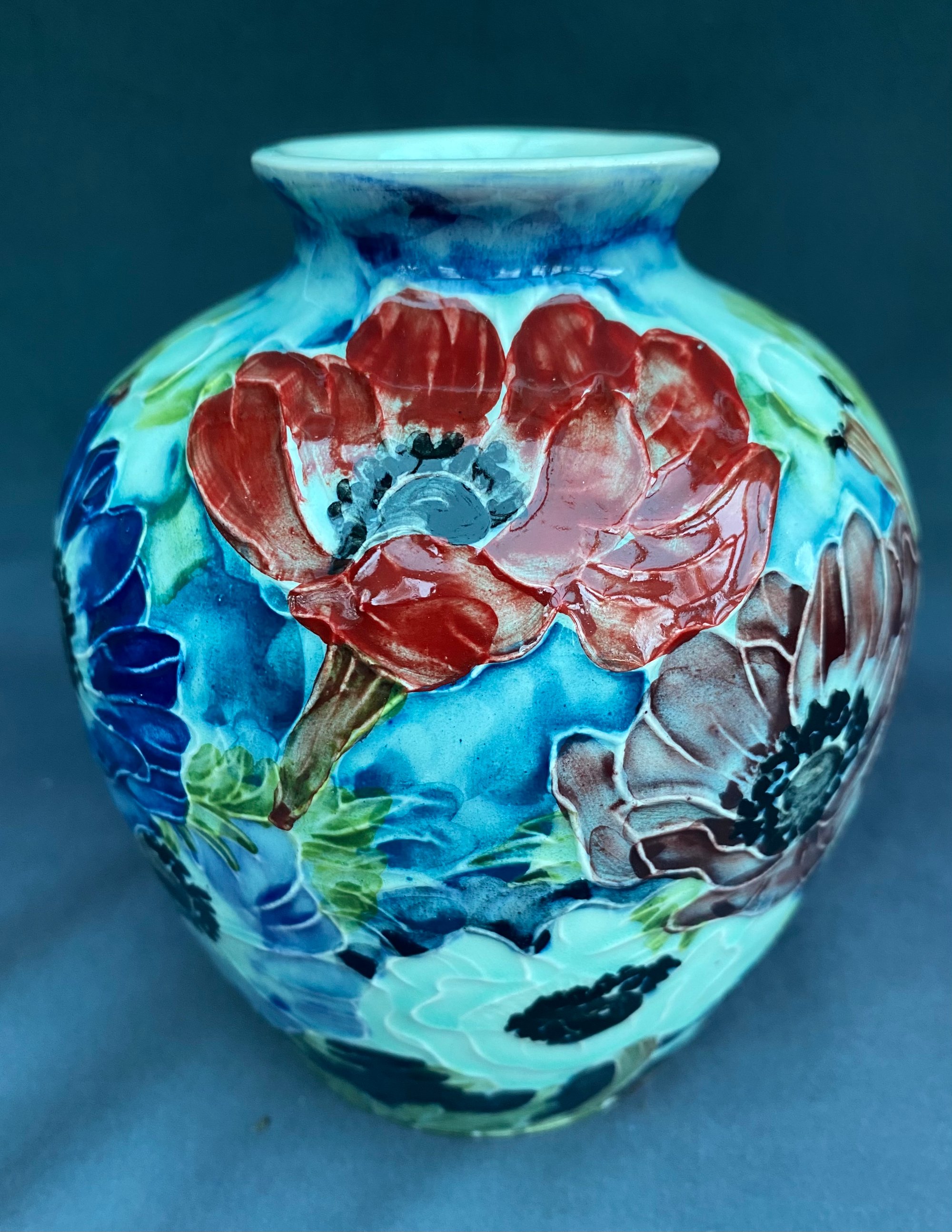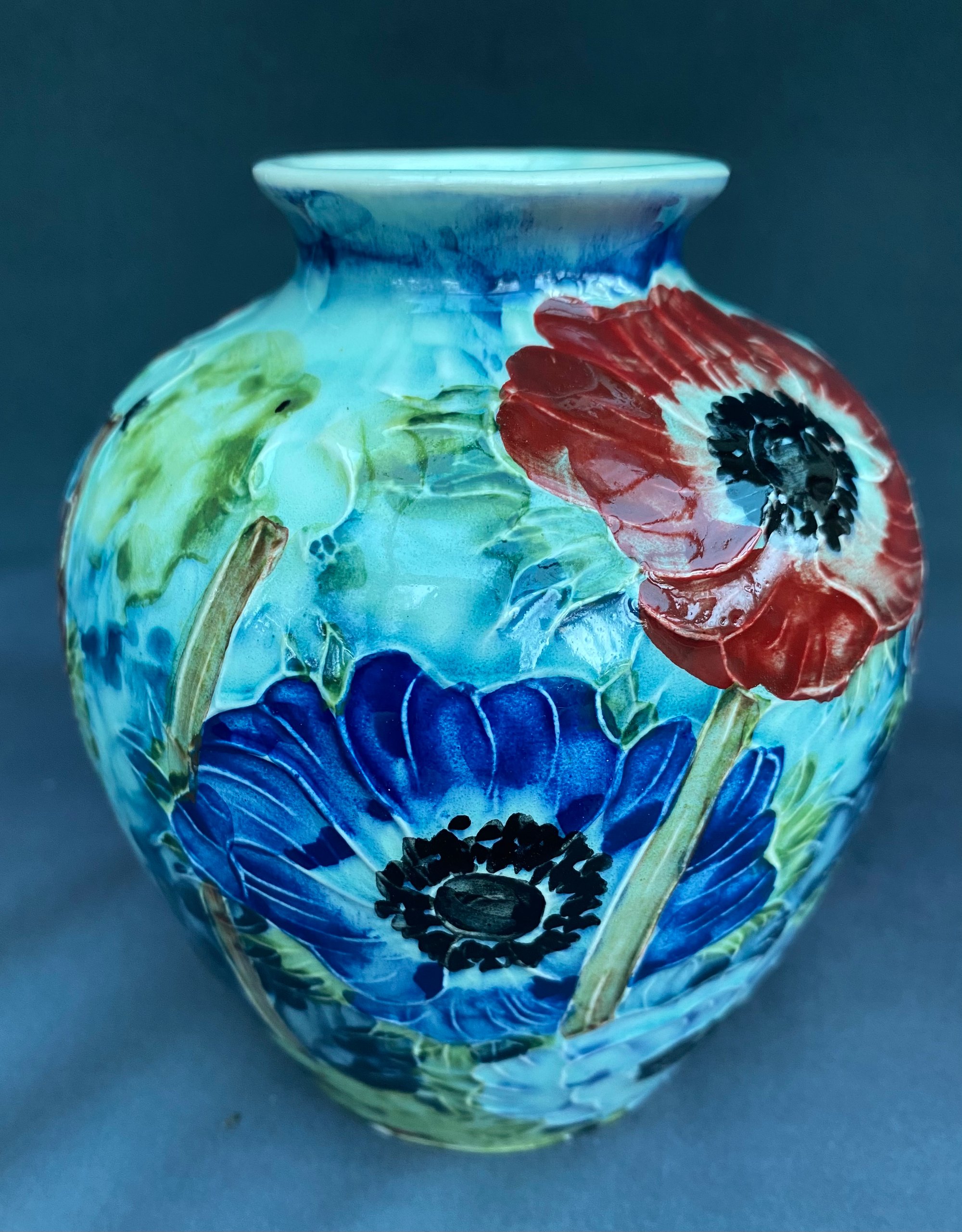 A cast shape vase with a raised outline of slip and then painted with under-glaze colours.