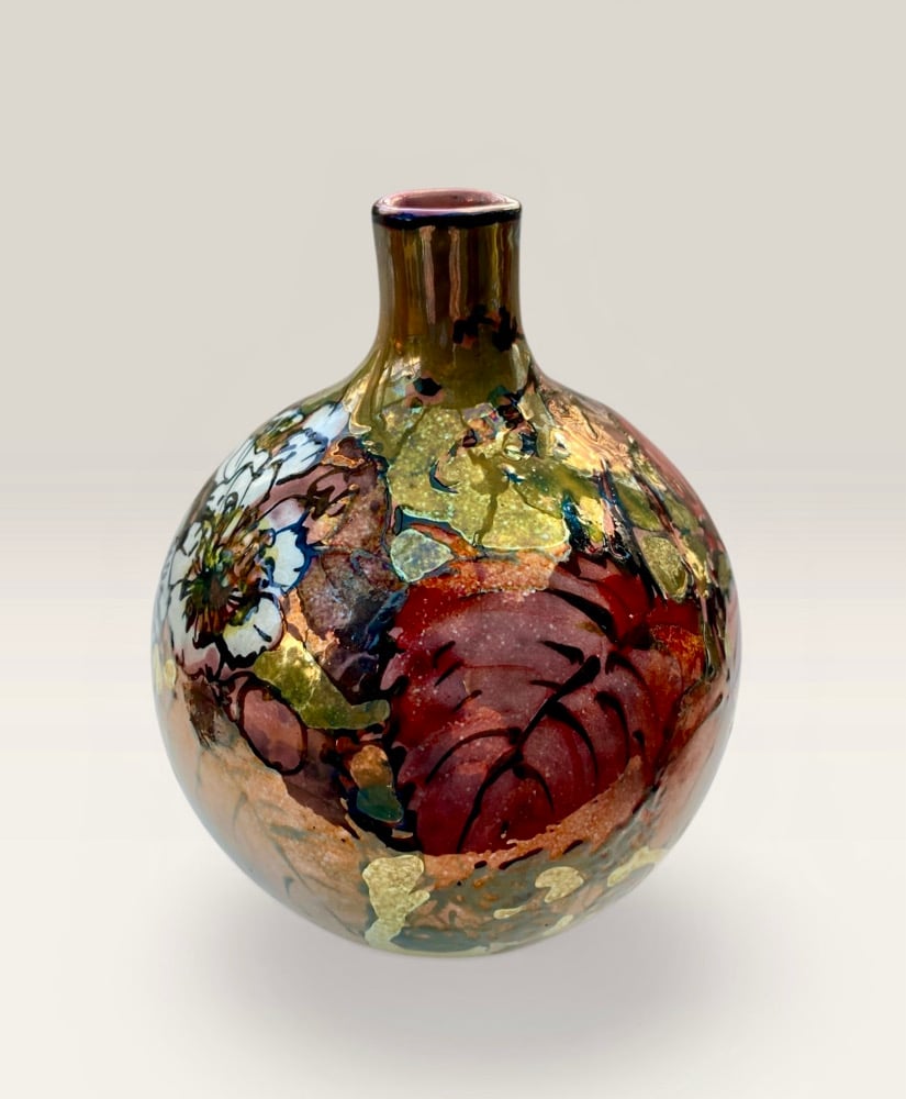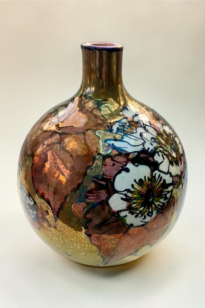 It is then decorated with metallic lustres and fired in a special reduction firing which reveals the lustrous effects.