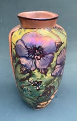 It is tubelined with a fine outline of slip, painted with underglaze colours and decorated with metallic lustres. It is then fired in a special reduction firing which reveals the lustrous effects.