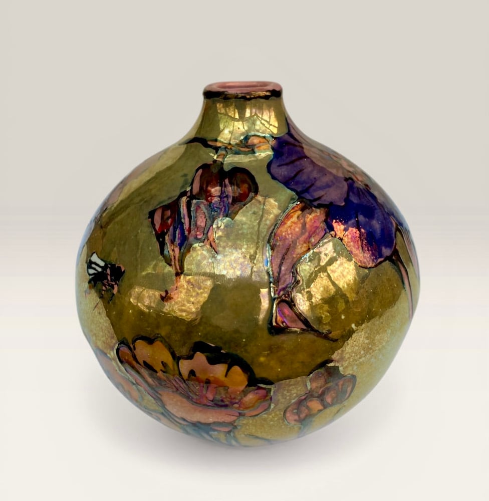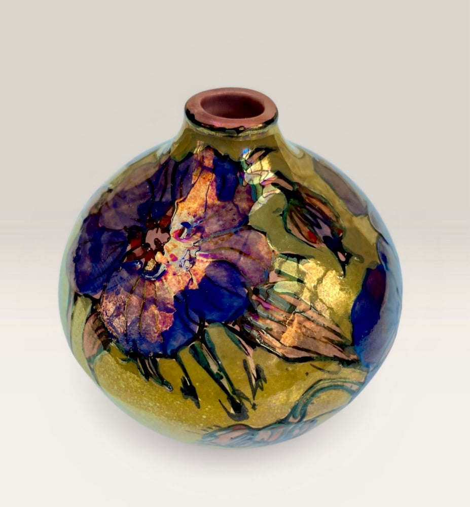 It is then decorated with metallic lustres and fired in a special reduction firing which reveals the lustrous effects.