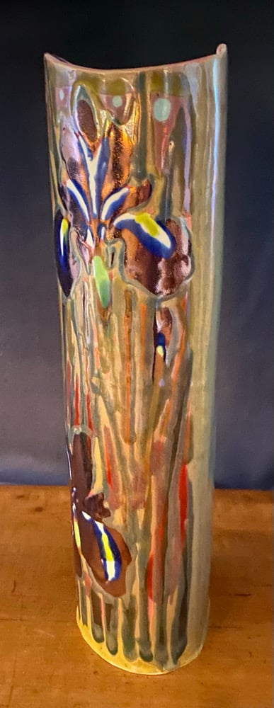 This “Iris” vase is hand formed from white earthenware and decorated with coloured glazes. It is then outlined with lustre and finally reduction fired.