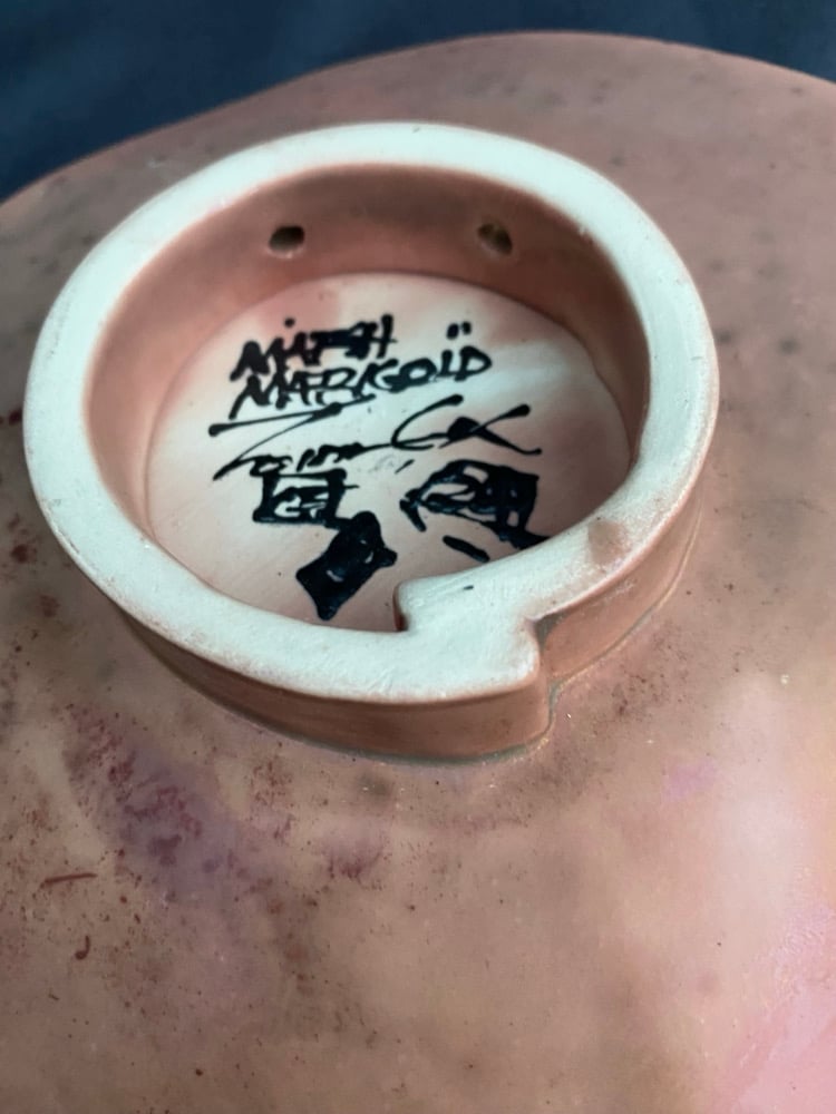 This hand formed plaque is tubelined with a fine line of slip and painted with underglaze colours then fired and dipped in a satin matt glaze which I have specifically formulated to enhance the lustre development. Finally it is painted with compounds of silver and copper and fired in reduction.