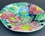 A hand formed bowl with a raised outline of slip and then painted with under-glaze colours.